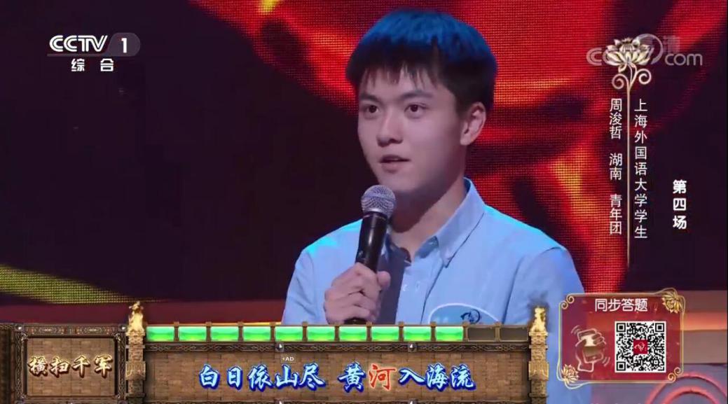 2019年春节期间,第四季《中国诗词大会》在中央电视台播出,为广大 观众奉上了一场诗意盎然的文化盛宴。上海外国语大学学子周浚哲作为“青年百人团”成员,代表上海赴京,亮相央视荧屏。