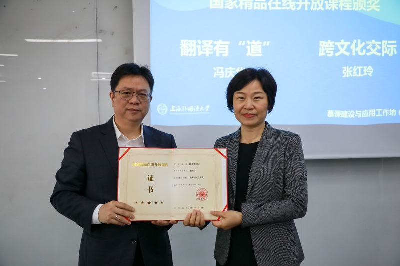 李岩松校长首先为“翻译有‘道’”和“跨文化交际”两门国家精品在线开放课程颁奖,对两门国家精品在线开放课程表示衷心的祝福,对慕课工作给予了充分的肯定,并向所有参与慕课建设的教师和同学表示感谢。