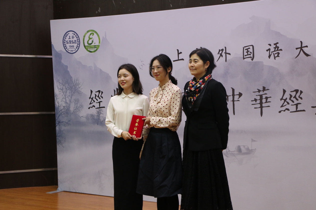 最后,嘉宾们上台为获奖选手一一颁奖。至此,上海外国语大学“经典咏流传”中华经典诵读大赛圆满落幕。本次大赛深刻诠释了中华优秀传统文化的内涵,彰显了中华语言文化的魅力,吸引了众多学生的积极参与,在校园内营造了传承中华经典,弘扬中华优秀传统文化的良好氛围。