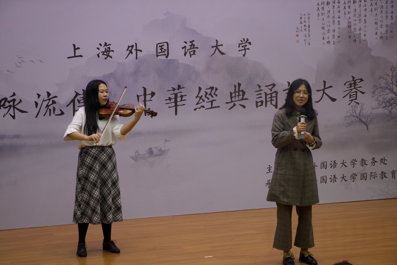 工作人员核算评分的同时,来自国际教育学院的王紫怡和林君逸同学为大家带来了一首曲风优美、意境深远的《往日时光》。