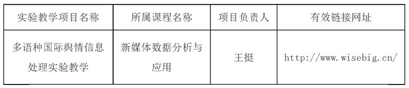 根据《上海市教育委员会关于开展2019年度上海市级虚拟仿真实验教学项目认定工作的通知》(沪教委高〔2019〕18号)文件要求,经审核,拟推荐王挺负责的“多语种国际舆情信息处理实验教学”为申报项目。现将拟推荐申报项目予以公示。