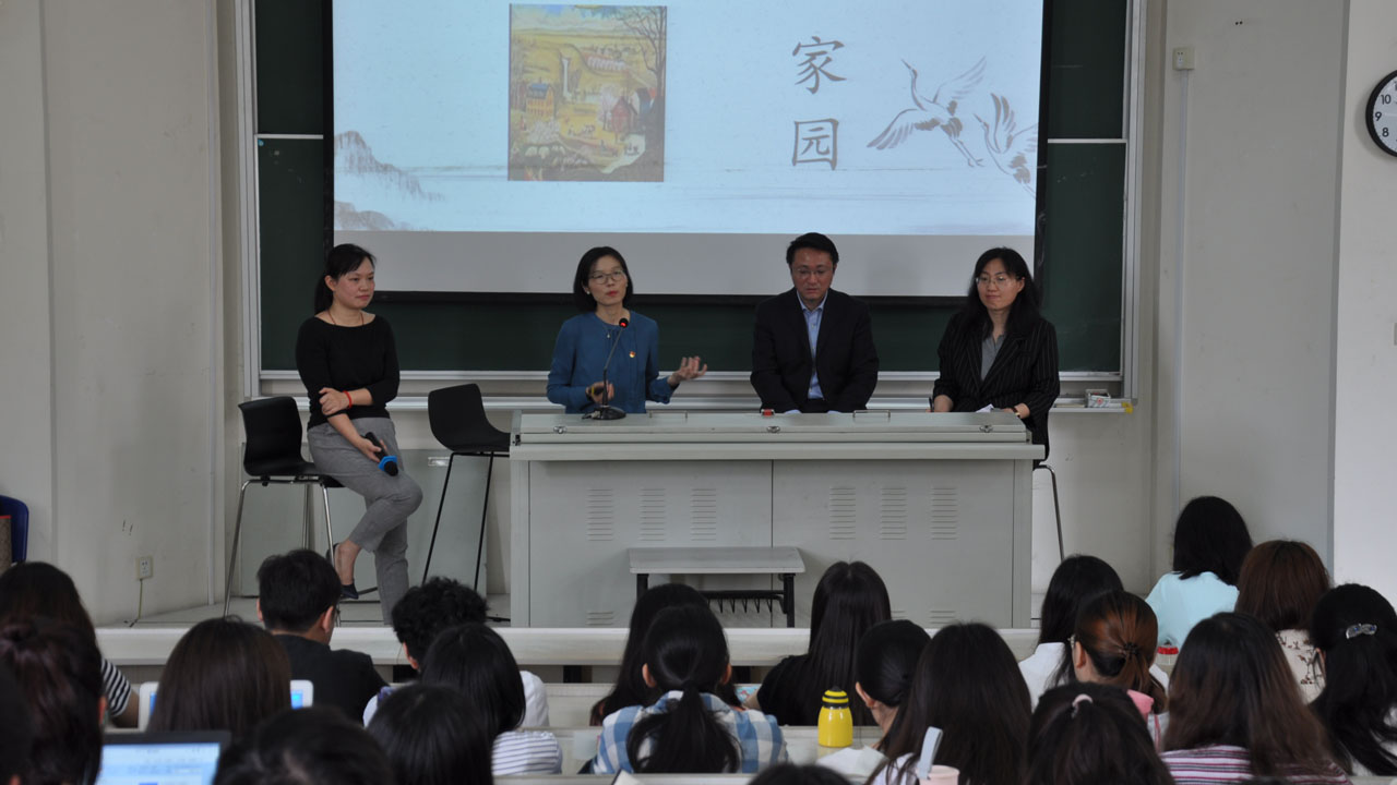 2019年5月27日上午,英语学院《英美概况》课程团队杨维嘉、孙麟、忻华、张新彬四位教师共同上了一堂别开生面的《英美概况》课程思政创新 英语公开课。作为2019年上外春季学期“课程思政”系列公开课之一,本公开课在教学形式和方法上锐意创新,采用国际学术会议公共讨论形式,四位教师联袂主讲,建立“师师、师生、生生”三维讨论空间。