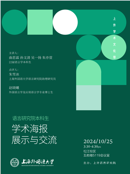 SISU学术角第七十九期活动由教务处主办,语言研究院承办,以“语言学专业本科生学术海报展示与交流”为活动主题,将于10月25日(本周五)下午15:30-16:30 在松江校区五教楼5119会议室准时开启,欢迎大家积极参与!