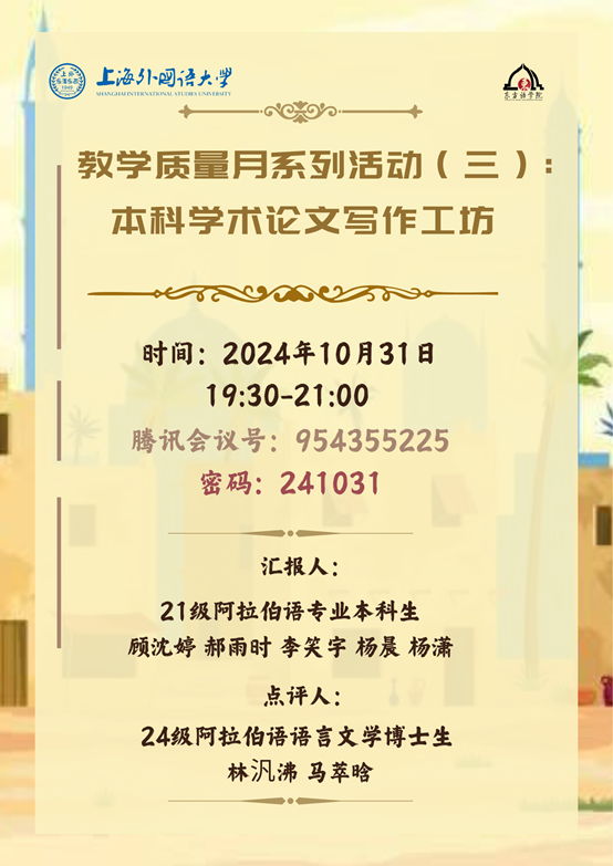 SISU学术角第八十期活动由教务处主办,东方语学院承办,以“本科学术论文写作工坊”为活动主题,将于10月31日(本周四)晚19:30-21:00 线上举行,欢迎大家积极参与!