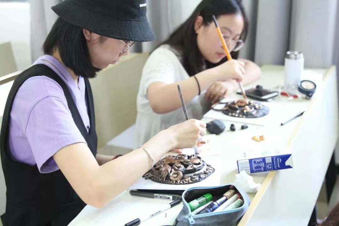 “先将黏土揉搓成圆球,将圆球按压在泡沫板上,压出门环的基本形状。然后给门环安上眼睛、环上眼皮、镶上眉毛、垒出鼻子和唇齿,搓出大小合适的圆环。”郭老师一边耐心讲解,一边亲手示范着,“最后轻轻刷上颜料,使门环复古而逼真。”在专家的指导下,同学们兴致勃勃地创作着,每位同学创作的门环都不一样。“你这门环很是威严粗犷,同学是来自北方的吗?”“这个门环颇有古希腊神话的影子,你平时很喜欢阅读外文故事吧?” 郭老师与同学们亲切而热烈地交流着,不时引得阵阵欢笑。