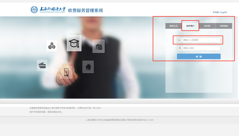 2我校参加本校辅修专业学习的同学,由于财务系统设置原因,请选择校外用户选项卡,人员编号一栏输入辅修学号如:fxsw018xxxxxxx),姓名一栏输入本人姓名登录后,选择缴费项目【2019-2020学年第二学期辅修(松江校区)】进行缴费。
