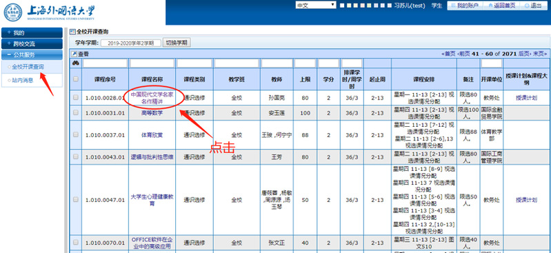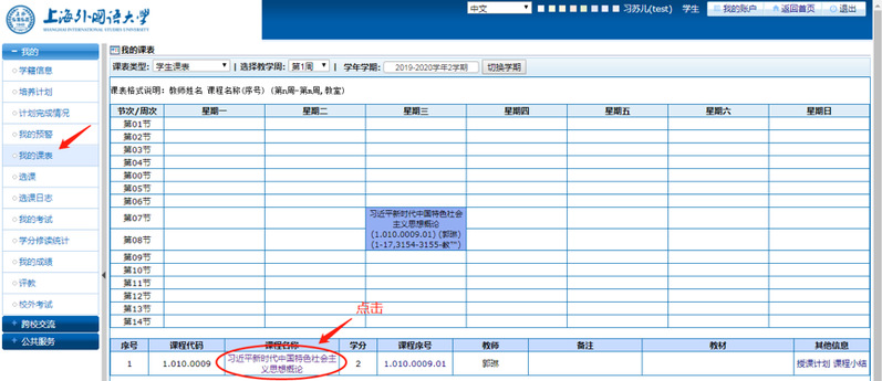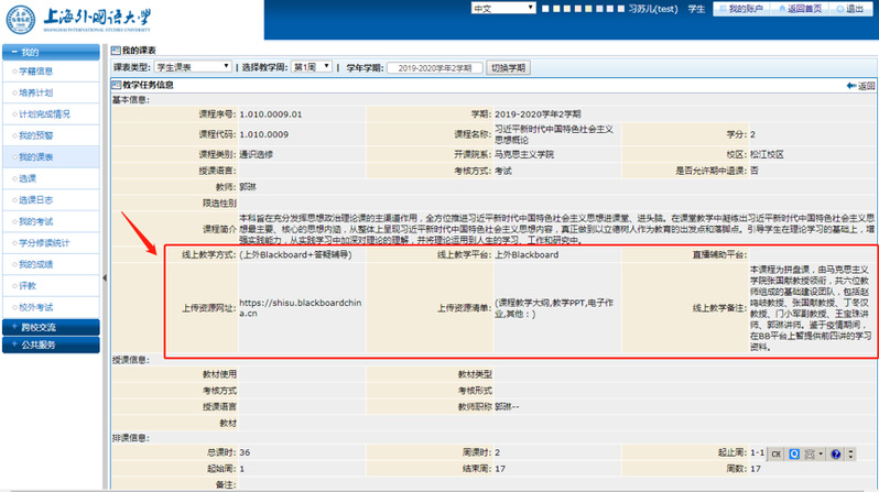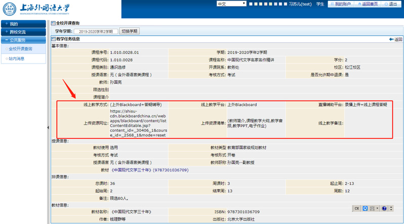 可在“全校开课查询”页面点击课程名称查看课程信息(含线上教学信息);“我的课表”内亦可点击课程名称查看课程信息(含线上教学信息)。如下图所示: