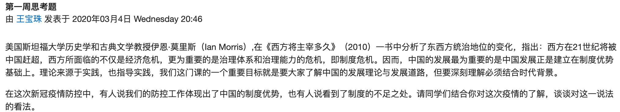 思政课的核心在于育人,如何把握这一核心提升教学效果是我们考虑的首要问题。时代是最好的素材,如何使“宅”在家中的学生关心天下事,在各种自媒体信息中学会明辨,特殊时期也给了我们一个引导的好时机。比如,第一周的导论,主要内容是马克思主义中国化的两大理论成果。马克思主义之所以能够在中国大地闪耀真理光芒,正是因为其与中国具体实际相结合,实现了中国化。马克思主义是“伟大的认识工具”,是人们观察世界、分析问题的有力思想武器。知识性教育是必须的,但对于大学生而言,逻辑思维的训练更是重要的。如何才能真正感受并运用这种方法论呢?面对知识结构较为全面的大学生和研究生,我们不能够回避问题,而应该直面问题。一直以来,我都在课堂上引导学生能够在面对陌生问题具备自己的逻辑架构、系统方案和应对行动,这样才能在纷杂的信息中保持清醒的头脑,有自己独到的见解。因此,在适当的引导之下,第一周我给学生抛出讨论题“在这次新冠疫情防控中,有人说我们的防控工作体现出了中国的制度优势,也有人说看到了制度的不足之处。请同学们结合你对这次疫情的了解,谈谈对这一说法的看法。”同学们积极查询资料,辩证分析,取得了较好的效果。沉重的时代背景,增添了毛中特这门课的厚度。
