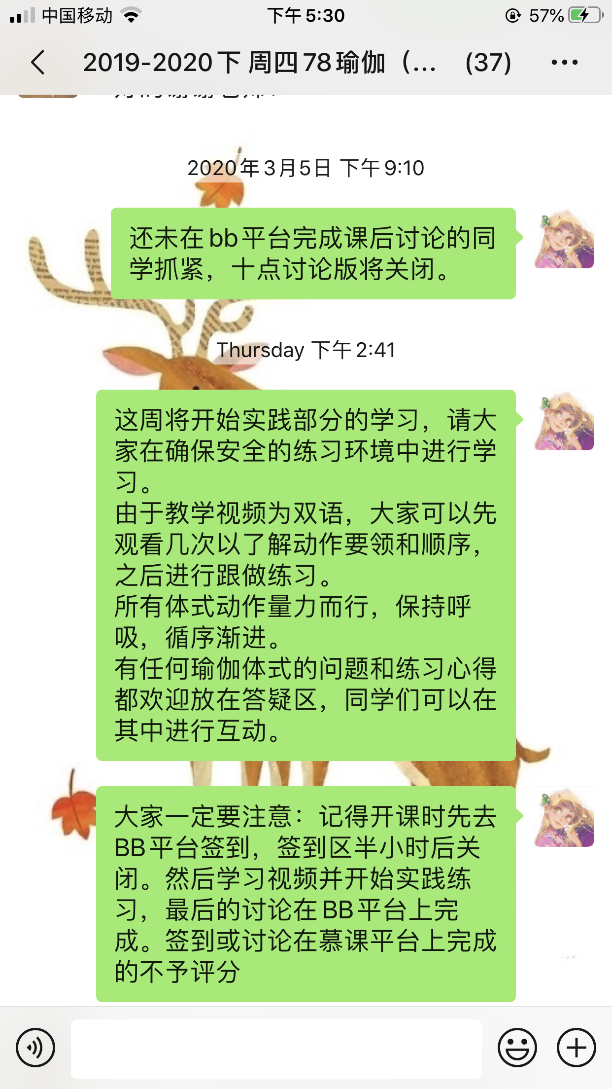 开课前组建课程微信群,及时发布课程信息和课前须知。由于居家体育课更需要保持教学规范。我们在前期的线上教学中重点安排理论性学习内容,包括瑜伽练习特点、练习注意事项、热身与放松。每节课要求学生规范着装,根据居家条件在确保安全的前提下进行习练。