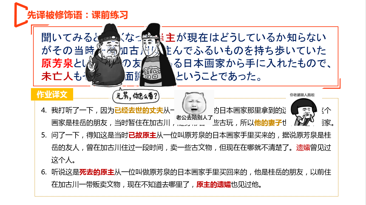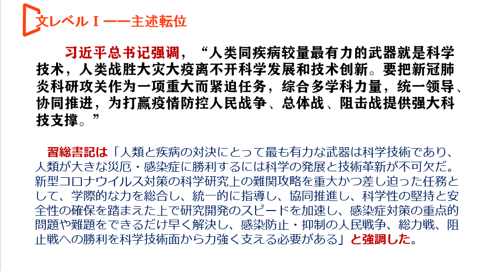 大三笔译课采取“实用化笔译实践+反馈式录播课程”的方式。本学期的笔译课主要讲解句子层面的翻译方法,我们从中日不同语境下的疫情动态报道中,找出与教学目标相关的语料和素材,分别安插到课前练习、课堂练习和拓展练习里面。所有练习与教学目标一一对应,增强笔译课程的实用性。所选例句尽量体现价值引导,践行笔译课的思政导向。