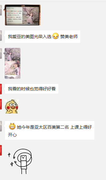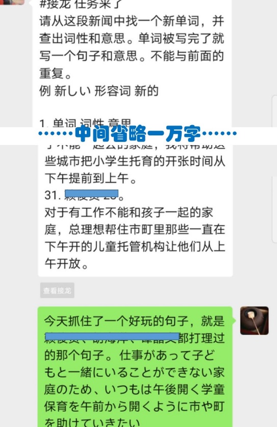 此外,一周五天的精读课有四天是早上1-2节,因此对于宅家的夜猫人群来说,早起成了最大的挑战。每周我们用不同的方式签到,比如微信接龙、签到程序、平台任务打卡等,并对打卡迟到的同学进行私信提醒。课堂时间在微信群里分享带有音频和文字稿的NHK慢速日语新闻,布置“新闻单词大发现接龙”、“给小朋友译一堂NHK for school”等不同的互动任务,帮助学生学以致用,并尽快进入学习状态。