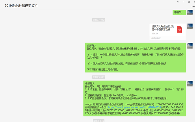 除了在教研室内的交流与分享,平行班课程或相关课程的老师们还会形成教学团队。教学团队成员间的关联更紧密,合作也更具有针对性。他们采用统一课程要求,统一教学资料,统一课程平台,“三统一”的教学模式。每周末团队成员间会进行多次微信电话,分享本周教学经验,讨论本周在线教学中遇到的问题,重新设计下一次课程的教学安排,并分工补充新的教学资料至教学平台。这样的合作方式有利于发挥集体智慧,不同的分工提高了工作效率,无间的合作则促进共同进步。