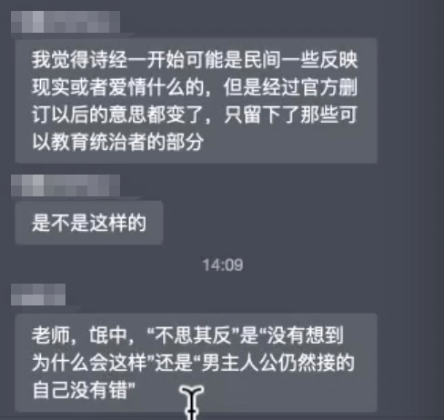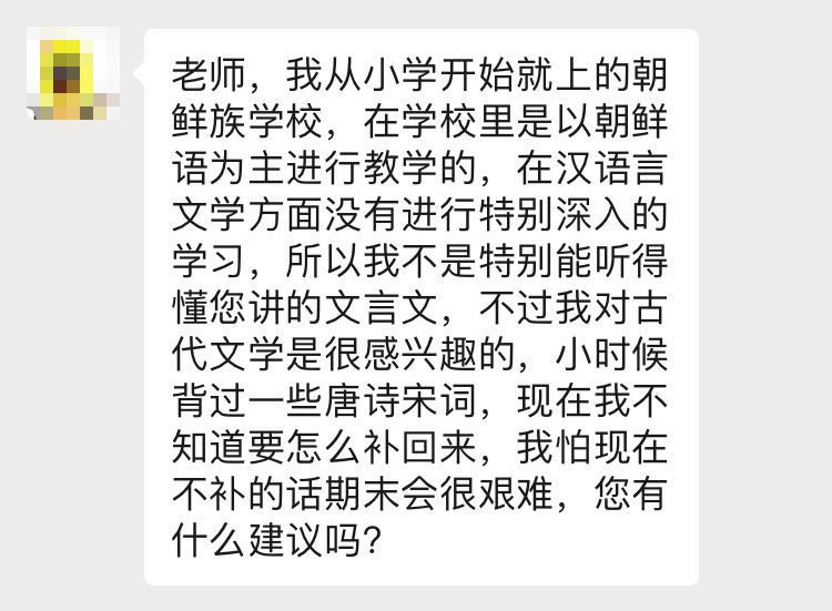 开展线上教学以来,学生在线问学的热情和频率很高,曾有学生提到自己从小上的是以朝鲜语为主进行教学的朝鲜族学校,没有深入学习过汉语言文学,但对古代文学十分感兴趣,希望老师提供一些学习建议,帮助她准备期末考试。可见,快节奏的线上教学,能够让学生迅速认识到自己和其他同学的差距,并作出积极的反应。而教师也可根据学生不同的文学基础和学习进度调整教学策略,指明学习方向。凭借丰富的在线教学、问学的方式,学生可以应对考试,而人文教育也通过教师的熏陶和文学的浸染得以延续。