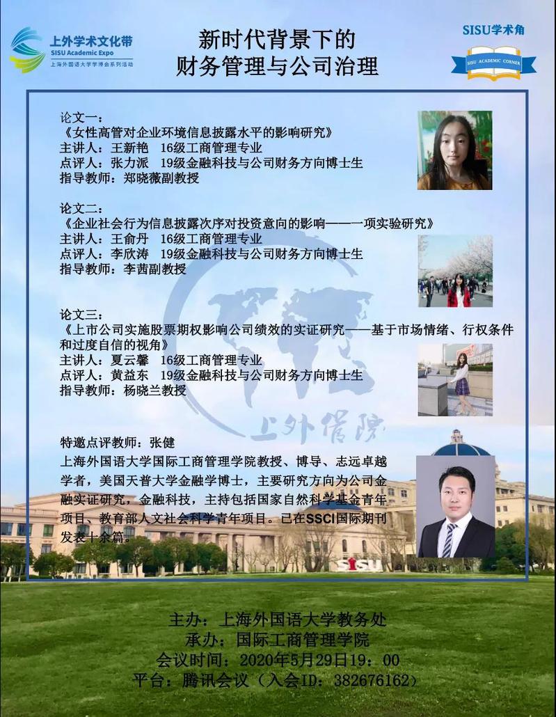 本期学术角活动由国际工商管理学院承办,将于5月29日(本周五)19:00准时开启!本期活动将围绕“新时代背景下的财务管理与公司治理”这一议题,点评、研讨、交流本科生的三篇优秀毕业论文。
