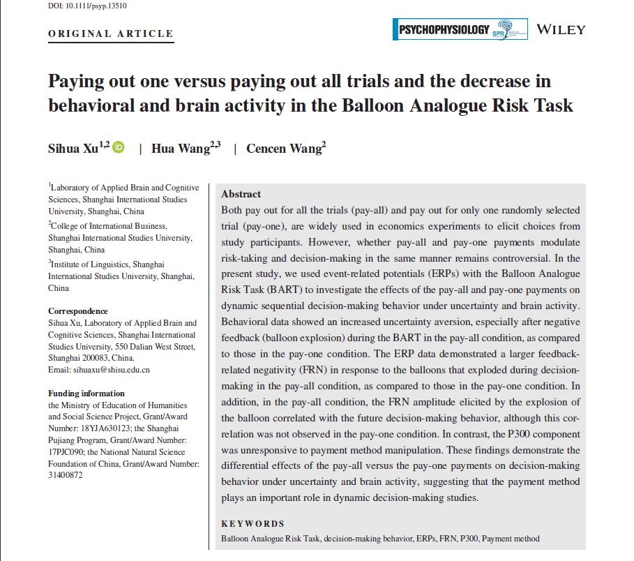 2020年2月,上海外国语大学脑与认知科学应用重点实验室研究团队,以上海外国语大学为第一单位在脑电领域权威刊物Psychophysiology上发表学术论文“Paying out one versus paying out all trials and the decrease in behavioral and brain activity in the Balloon Analogue Risk Task”,徐四华教授为本文第一作者和通讯作者,语言研究院的博士生王华和国际工商管理学院的硕士生王岑岑为论文的合作者。