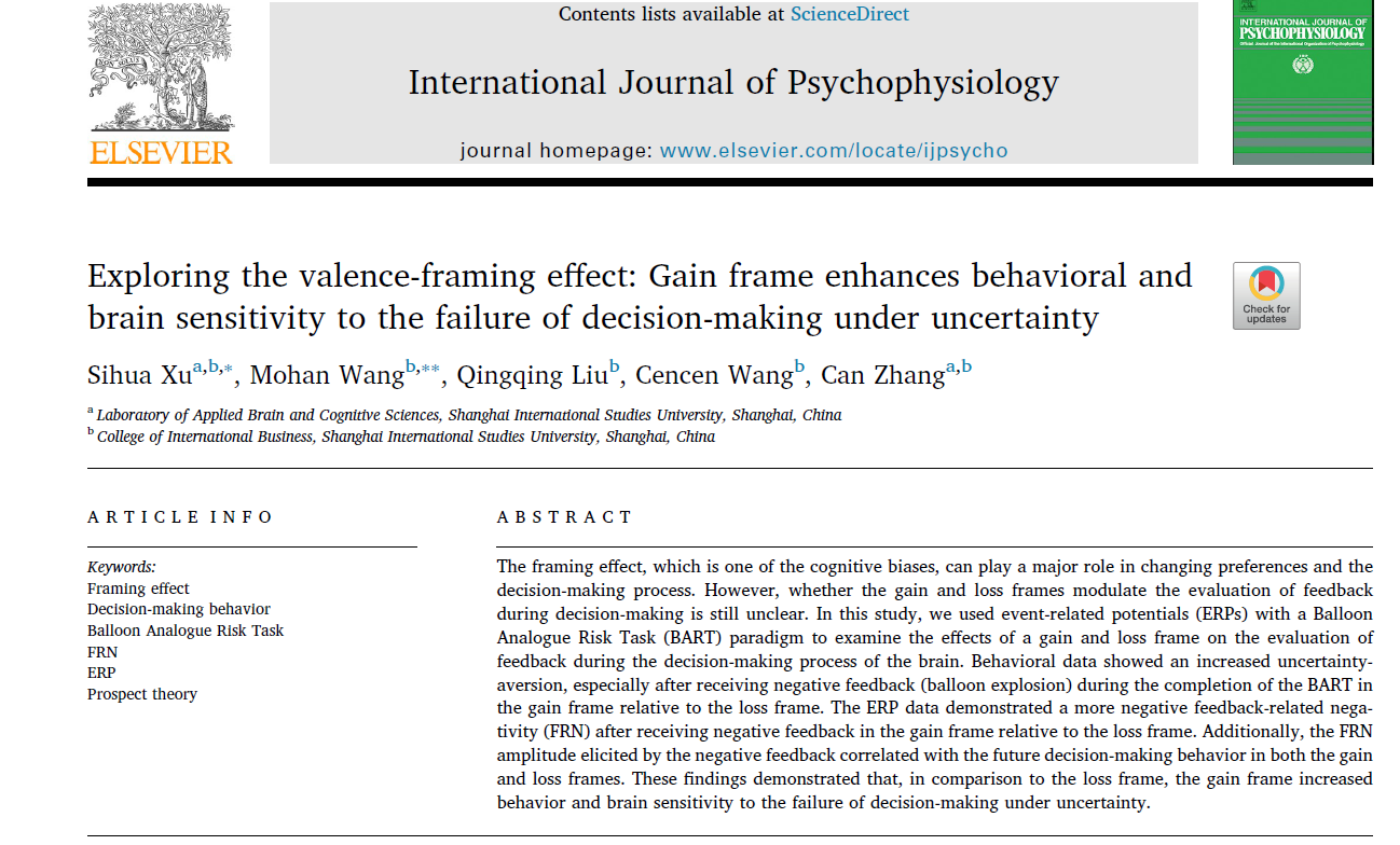 2020年5月,上海外国语大学脑与认知科学应用重点实验室研究团队,以上海外国语大学为第一单位在脑电领域知名刊物International Journal of Psychophysiology上发表学术论文“Exploring the valence-framing effect: Gain frame enhances behavioral and brain sensitivity to the failure of decision-making under uncertainty”,徐四华教授为本文第一作者和通讯作者,王墨涵助理教授为本文的并列通讯作者,徐四华教授所指导的硕士生柳青青、王岑岑和博士生张灿为本文的合作者。