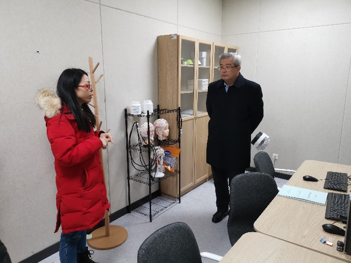 在磁共振成像研究中心,潘煜院长向张旭院士介绍了实验室建设现状,并就未来硬件软件建设规划予以展望。潘院长介绍到,磁共振成像中心的建设符合前沿科学发展趋势,其作为我校落实立德树人的根本任务、提升全球话语能力战略中的强力推手,为深入推进“多语种+”办学战略稳健助力。