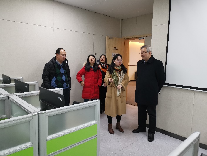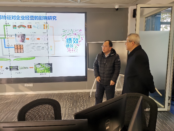 随后,张旭院士到访人工智能与数据科学应用实验室,了解我院大数据教学科研平台的建设及使用现状,并询问相关硬件设施的配套情况。张院士高度评价了我院以计算中心为首的硬件建设方面取得的不菲成绩,肯定当下建设方向与“跨、通、融”为核心的新文科改革方向相一致,有力地推动了脑科学与管理学、经济学等学科的交叉融合研究。