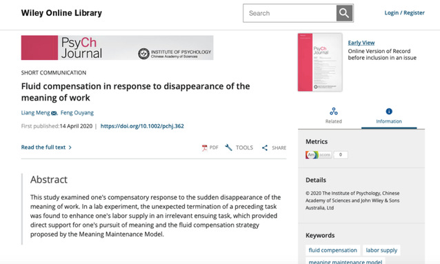 20204月,硕士研究生欧阳枫,在其导师孟亮副教授(消费行为与神经决策方向硕士生、博士生导师)的指导下,作为第二作者在SSCI期刊PsyCh Journal上发表学术论文Fluid compensation in response to disappearance of the meaning of workPsyCh Journal是中国第一本心理学专业的英文期刊,由中国科学院心理研究所主办。该研究通过一项实验室实验,发现工作意义消失会诱发补偿效应。该发现为人类对意义的追寻提供了佐证,也为意义维持模型中的流动补偿策略提供了证据。