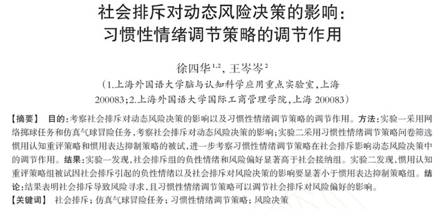 20196月,国际工商管理学院硕士研究生王岑岑,在其导师徐四华教授(消费行为与神经决策方向硕士生、博士生导师)的指导下,作为第二作者在CSSCI期刊《中国临床心理学杂志》上发表学术论文社会排斥对动态风险决策的影响:习惯性情绪调节策略的调节作用。此外,该生还以合作者身份与其导师(第一作者兼通讯作者)SSCI一区期刊PsychophysiologySCI二区期刊Cognitive, Affective, & Behavior Neuroscience发表了2篇学术论文。