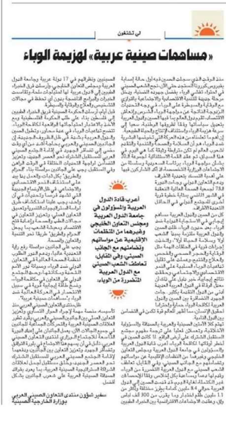 中国驻伊拉克大使馆:7月1日,伊拉克发行量最大的官方报纸《晨报》刊发中阿合作论坛事务大使李成文署名文章《团结合作、命运与共,为战胜疫情作出“中阿贡献”》。