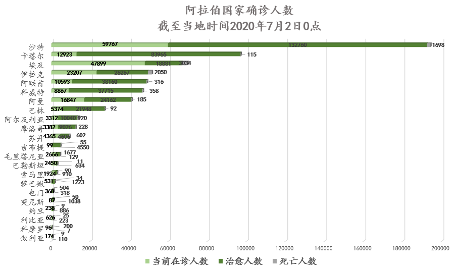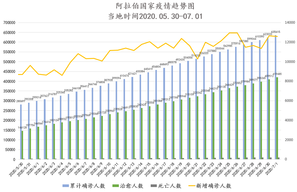 截至当地时间7月2日0点,阿拉伯国家累计确诊635615例,死亡10335例,治愈419485例,其中20个国家出现新增确诊病例共计12582例,与昨日基本持平。约旦、突尼斯、黎巴嫩、科摩罗、吉布提、卡塔尔、阿联酋、科威特、索马里、苏丹疫情稳定。也门、毛塔治愈率稳步提升;巴林、科威特近期新增病例呈上升趋势;沙特在诊人数继续上升,今日新增病例较昨日大幅下降。伊拉克、阿曼、埃及新增病例仍未出现明显下降趋势,在诊人数持续上升,伊拉克累计确诊破5万。巴勒斯坦、阿尔及利亚疫情持续反弹,今日新增病例均创历史新高,治愈率不断下降;摩洛哥近期新增病例有所回落。部分疫情较稳定的国家依旧保持谨慎态度,继续延长全国总动员状态,多国各级部门积极落实政府缩减开支计划。部分疫情形势依旧严峻的国家,逐步恢复国际航班和开放旅游景点。河北省向巴林捐赠口罩已运抵;伊拉克《晨报》刊发中阿合作论坛事务大使李成文署名文章;我驻巴勒斯坦办事处主任在当地主流媒体发文。