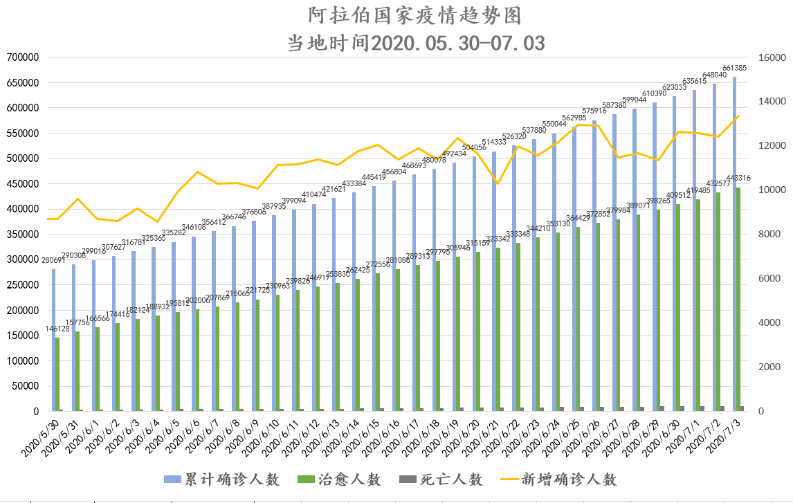 截至当地时间7月4日0点,阿拉伯国家累计确诊661385例,死亡10886例,治愈443316例,其中20个国家出现新增确诊病例共计13345例,再次上升。约旦、突尼斯、黎巴嫩、科摩罗、吉布提、卡塔尔、索马里、苏丹疫情稳定。阿联酋在诊人数上升,今日新增病例涨幅较大,累计确诊破5万;毛塔近期新增病例降幅明显,治愈率稳步提升;巴林、科威特在诊人数下降,但近期新增病例仍处于较高水平;沙特今日新增病例再次上升,但治愈率仍保持稳定,累计确诊破20万。伊拉克、阿曼、埃及新增病例继续维持高位;巴勒斯坦、摩洛哥疫情持续反弹,治愈率不断下降;阿尔及利亚新增病例再创单日最大增幅,但今日新增治愈人数也创下最高记录,整体治愈率无明显下降。海合会成员国已小范围恢复通航,沙姆地区国家已开放部分边界。疫情反弹形势较严峻的国家,除了应对国内疫情不断扩散的局面外,大量归国侨民和留学生中的输入型病例也给各国疫情防控工作带来挑战,目前世卫组织已向这些国家提供物资援助及防疫指导。利比亚自上海采购的物资已运抵。