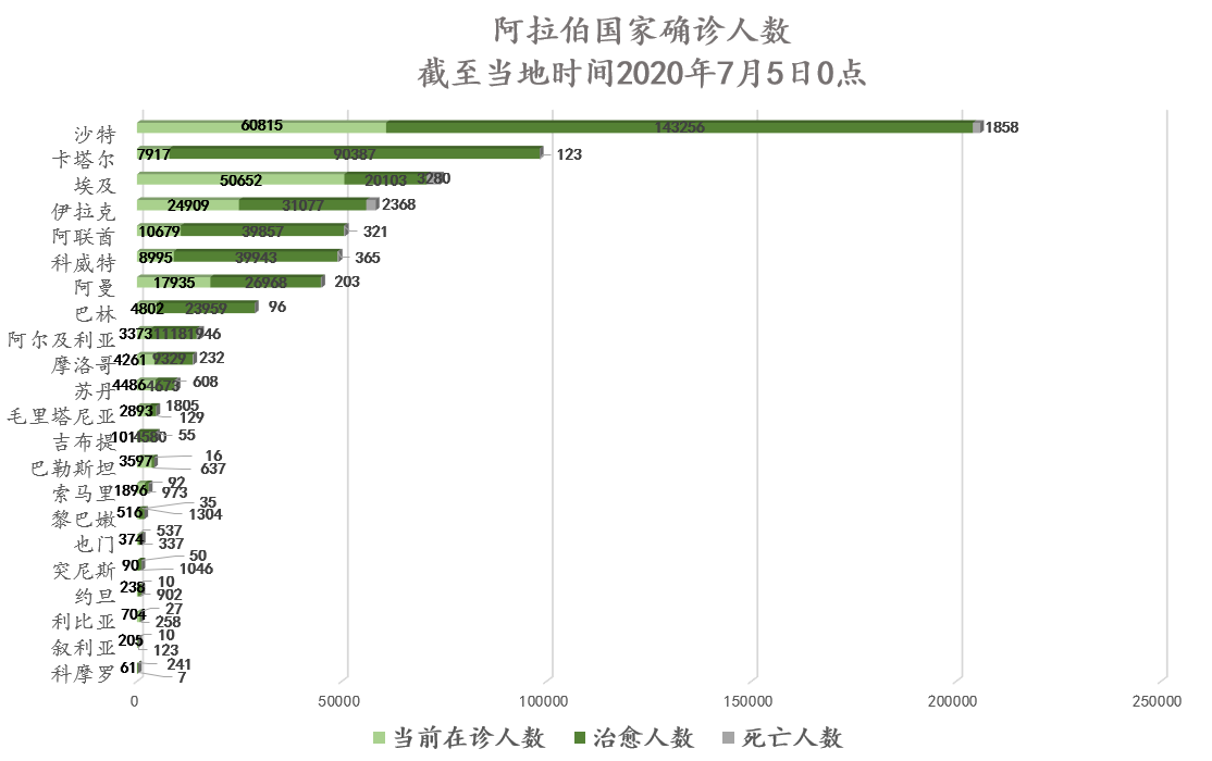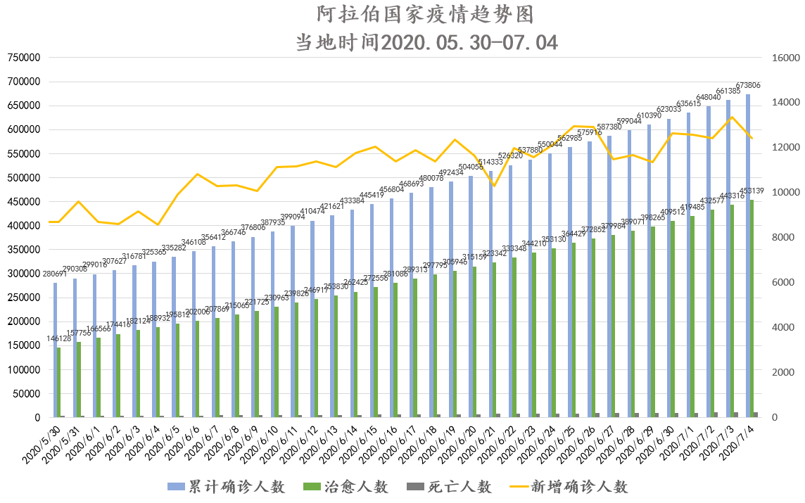 截至当地时间7月5日0点,阿拉伯国家累计确诊673806例,死亡11168例,治愈453139例,其中20个国家出现新增确诊病例共计12421例,小幅下降。约旦、突尼斯、黎巴嫩、科摩罗、吉布提、卡塔尔、索马里、苏丹、科威特、巴林疫情稳定。阿联酋新增病例继续呈上升趋势,但治愈率保持稳步提升;沙特在诊人数继续上升,近期呈波动上升趋势。伊拉克、阿曼新增病例继续维持高位,治愈率稳步提升;埃及治愈率小幅上升。摩洛哥今日新增病例涨幅较大;阿尔及利亚疫情持续反弹,今日新增病例再创新高;巴勒斯坦今日新增病例较昨日成倍增长,治愈率已降至12%。各国航空公司复航目的国数量不断增加,航空业、旅游业、酒店业将迎来经济复苏新阶段,各级政府部门员工到岗办公比例不断上升。随着检测技术逐渐成熟,多国下调核酸检测费用,并将新冠肺炎治疗费用纳入医保。国务委员兼外交部长王毅分别同沙特外交大臣、约旦外交与侨务大臣通电话,就中沙建交30周年及中阿合作论坛第九届部长级会议的召开交换意见。阿尔及利亚军机自中国运回41吨医疗物资及设备。