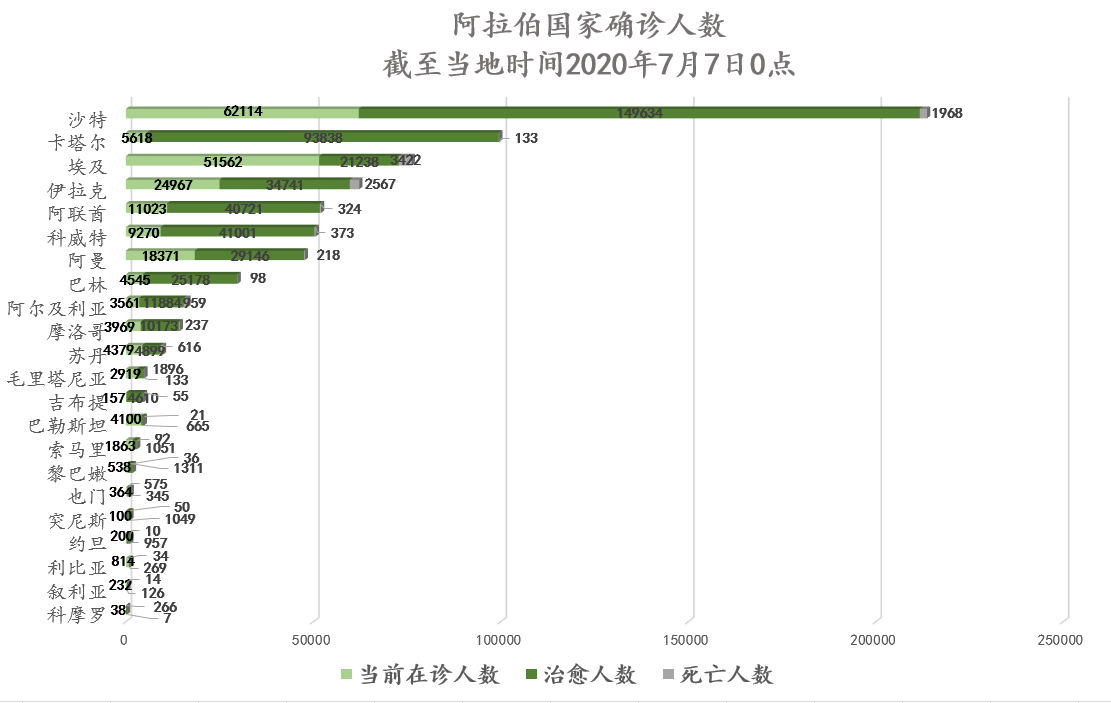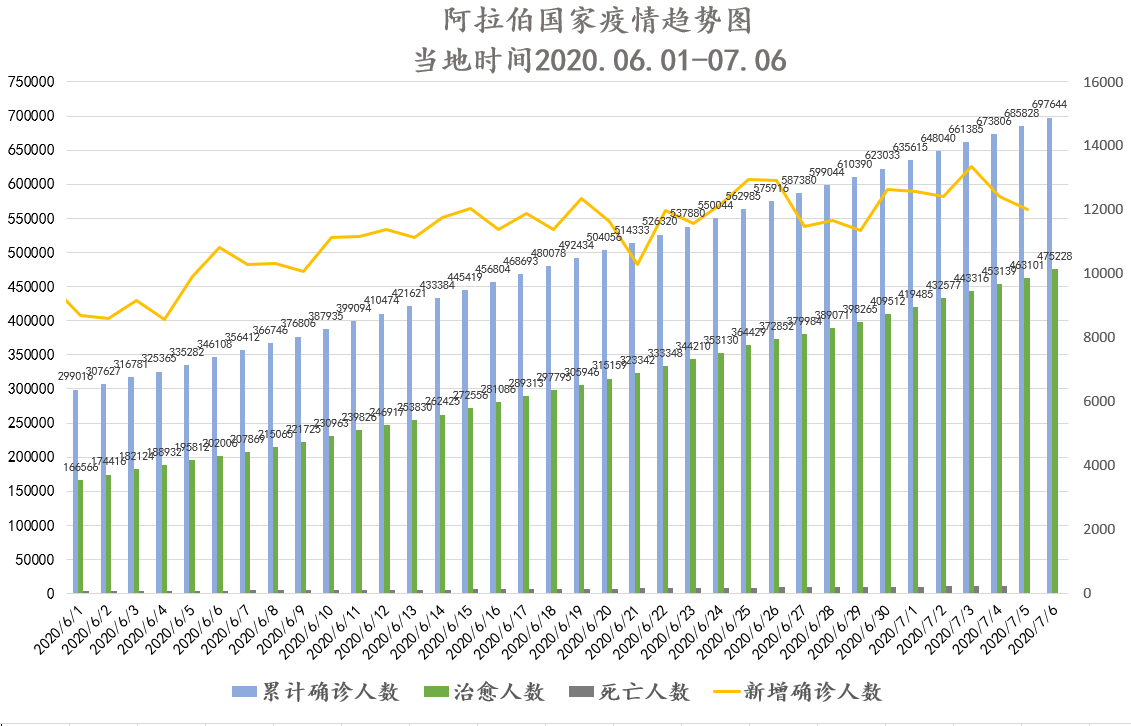 截至当地时间7月7日0点,阿拉伯国家累计确诊697644例,死亡11712例,治愈475228例,其中21个国家出现新增确诊病例共计11816例,小幅下降。约旦、突尼斯、黎巴嫩、科摩罗、吉布提、卡塔尔、索马里、苏丹、巴林疫情稳定。阿联酋、科威特在诊人数上升,近期新增病例涨幅明显;沙特在诊人数下降,近期呈波动上升趋势。阿曼今日新增病例大幅攀升;埃及、伊拉克近期新增病例开始回落,治愈人数稳步增加。阿尔及利亚今日新增病例再创历史最高记录,同时治愈人数大幅增加;摩洛哥、巴勒斯坦今日新增病例较昨日显著下降。多国政府将满足紧急卫生需求列为政府优先事项,迪拜将于今日起恢复对游客开放,旅客需持有效期内病毒检测阴性证明;疫情反弹形势严峻的国家,宣布再次延长国家紧急状态,重启全面出行禁令,对高风险地区实施严格人员进出管控。《今日埃及人报》刊载李成文大使署名文章;联合国驻黎巴嫩临时部队司令高度赞扬中国第18批赴黎巴嫩维和医疗分队为当地抗疫做出的杰出贡献。
