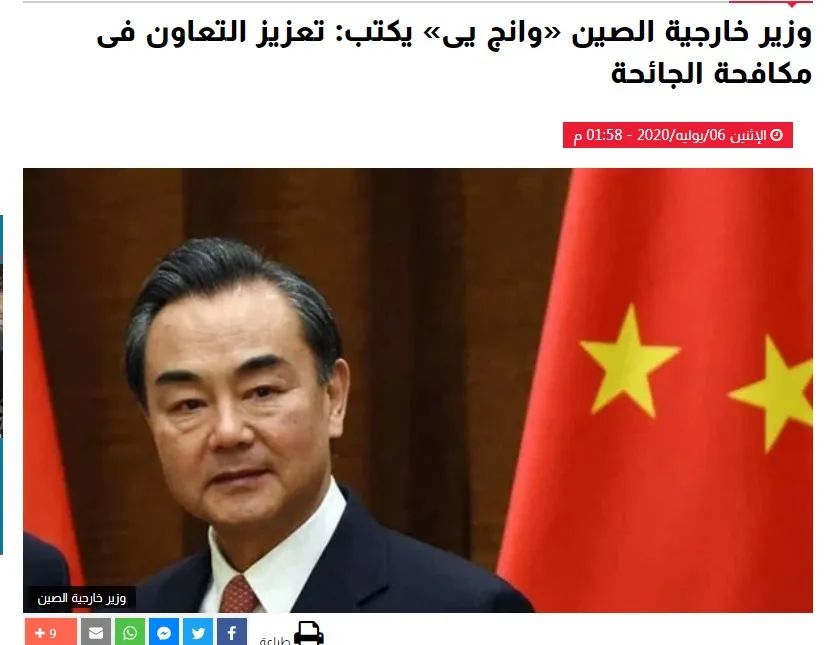 7月6日,埃及主流媒体《宪章报》发表王毅国务委员兼外长署名文章《加强抗疫合作,打造中阿命运共同体》(阿文),全文如下:
