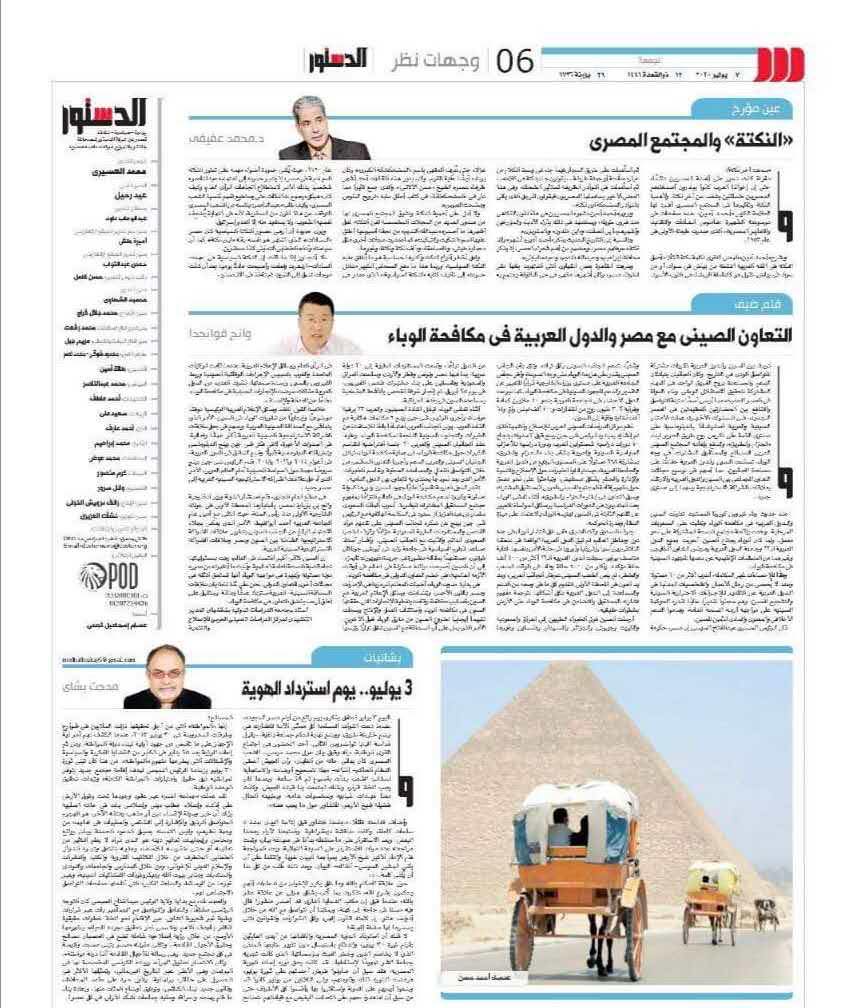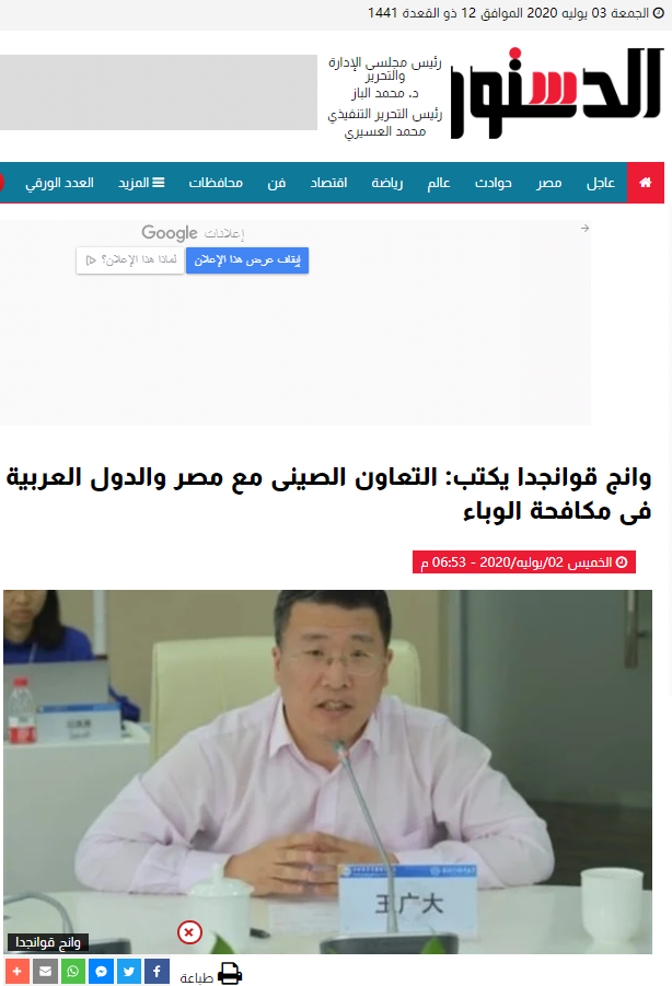7月2日,埃及主流媒体《宪章报》在其网站和报纸“观点”栏目同时发表上海外国语大学|中阿改革发展研究中心执行主任王广大教授文章《中国与埃及等阿拉伯国家合作抗疫》(阿文)。