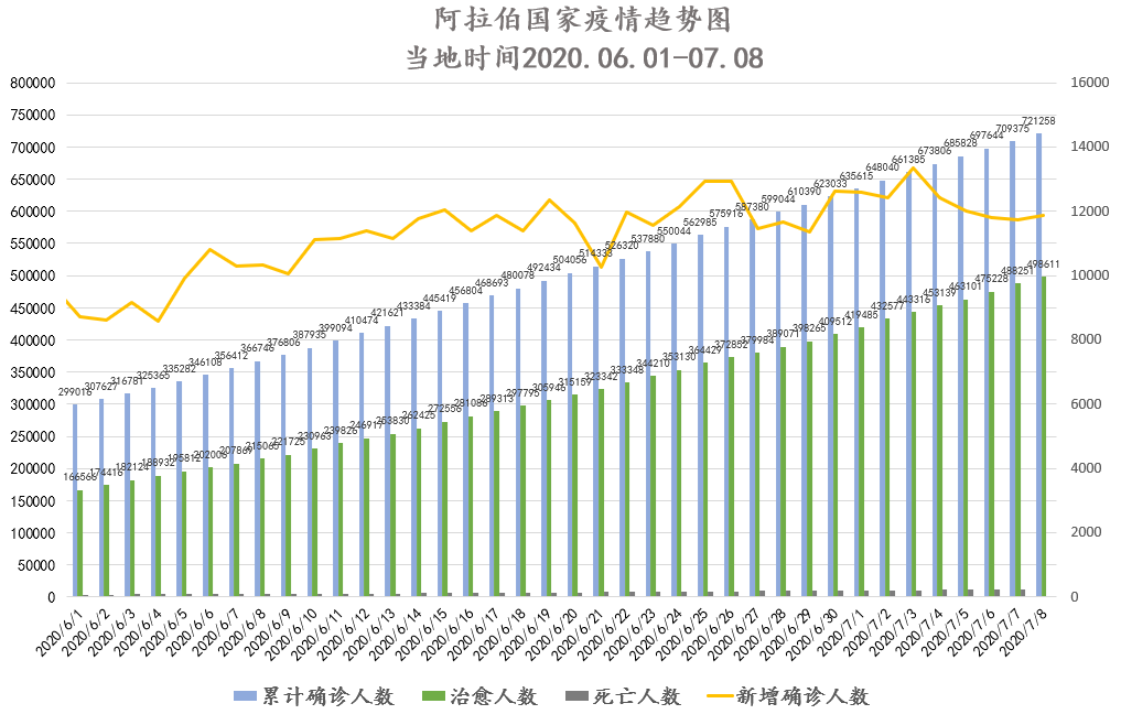 截至当地时间7月9日0点,阿拉伯国家累计确诊721258例,死亡12246例,治愈498611例,其中21个国家出现新增确诊病例共计11883例,小幅上升。约旦、突尼斯、黎巴嫩、科摩罗、吉布提、卡塔尔、索马里、苏丹、巴林、科威特、阿联酋、毛塔、也门疫情稳定。沙特在诊人数继续下降,每日新增病例已明显回落;埃及新增病例持续小幅下降,治愈率缓步提升;摩洛哥今日新增治愈人数创历史新高,在诊人数稳步下降。阿曼今日新增病例继续维持高位,累计确诊破5万;伊拉克今日新增病例再创历史新高,在诊人数呈缓步上升趋势。巴勒斯坦确诊人数持续攀升,治愈率已跌至10%以下;阿尔及利亚新增确诊人数已连续半个月上涨,但治愈率仍较为乐观;利比亚、叙利亚近期新增病例涨幅明显。截至目前,除利比亚在一定程度上收紧限制措施外,各国均已进入常态化防疫阶段,已开放国门迎接海内外游客的国家,旅游业呈现欣欣向荣的态势,海湾多国各大航空公司也不断增加航班旅行目的地。各国多措并举解决失业问题,开通线上求职平台,重视维护女性就业权益。我驻沙特大使、驻伊拉克库区总领事在当地主流媒体发文;钟南山院士与卡塔尔公共卫生部举行视频交流会;深圳侨办侨联向埃及中国和平统一促进会捐赠口罩。