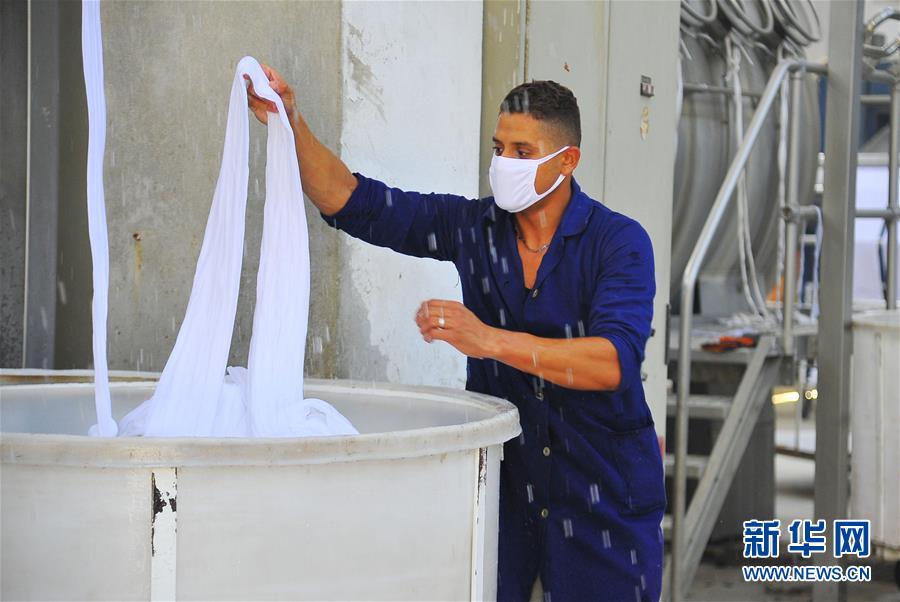 7月12日,一名工人在叙利亚大马士革生产制作口罩的原材料。