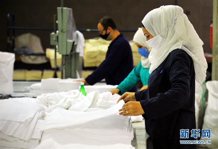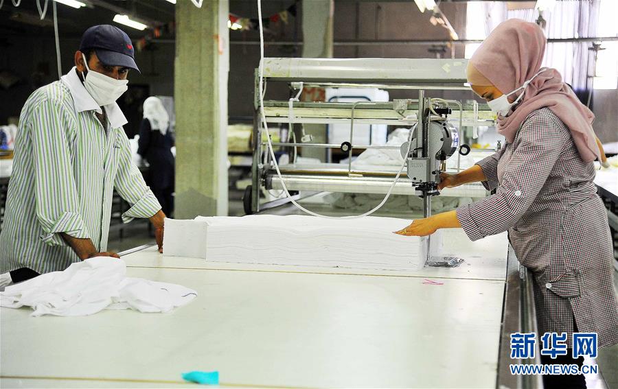 7月12日,工人们在叙利亚大马士革生产制作口罩的原材料。