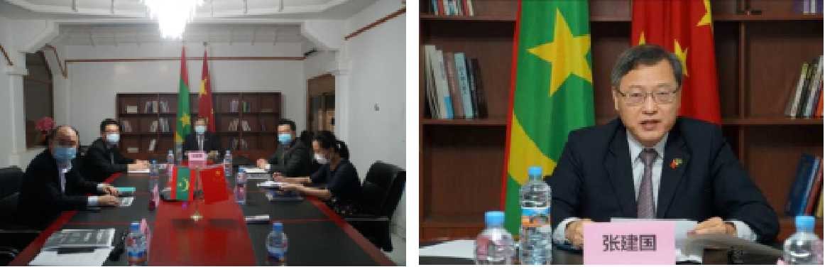 张建国大使在致辞中回顾总结中毛建交55年来两国关系的发展历程、现状特点与有益经验,就两国友好合作未来发展提出建议。张大使强调,中毛建交是1965年毛泽东主席、周恩来总理和达达赫总统以伟人的战略眼光与宏大气魄做出的历史性决策。55年来,中毛始终是志同道合的好朋友、平等互利的好伙伴、患难与共的好兄弟,两国关系长期保持高质量、高水平发展,堪称中非、中阿关系典范。双方应以庆祝两国建交55周年和开展抗疫合作为契机,进一步增强政治互信,深化互利合作,弘扬传统友好,加强团结协作,推动中毛友好合作关系更上层楼。