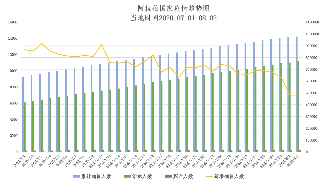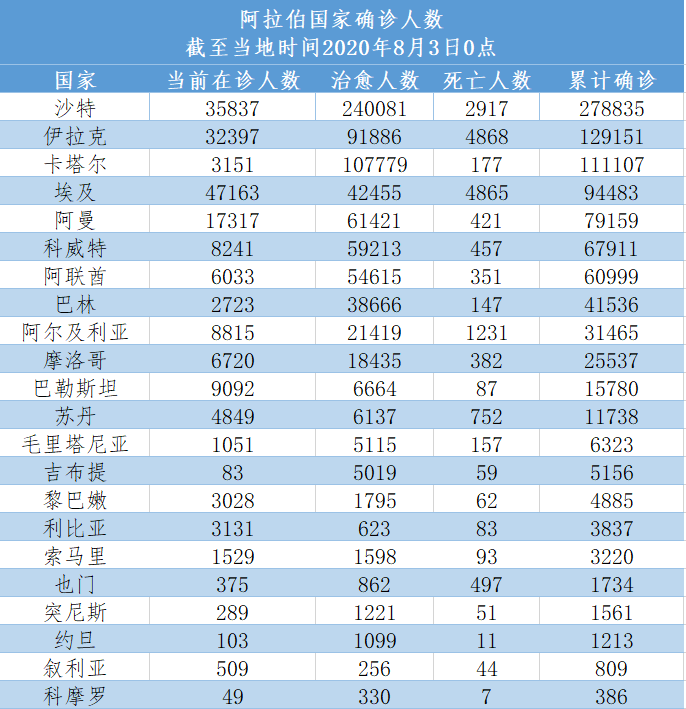 截至当地时间8月3日0点,阿拉伯国家累计确诊976825例,死亡17719例,治愈766689例,较一周前(7月27日0点)新增62396例。