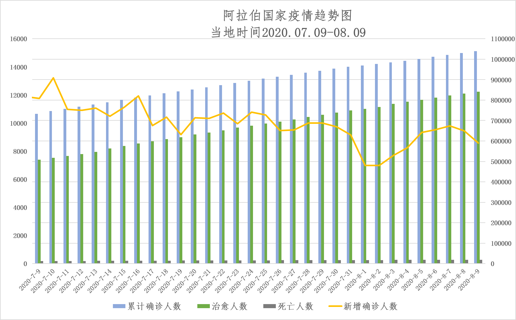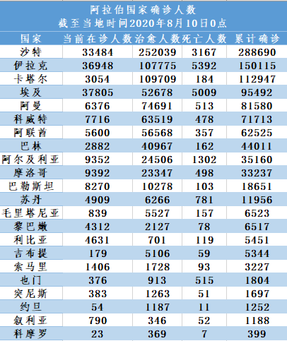 截至当地时间8月10日0点,阿拉伯国家累计确诊1039479例,死亡19088例,治愈841610例,累计确诊病例数突破百万,病亡率1.8%,远低于世界水平,治愈率约81%;较一周前(8月3日0点)累计新增62654例,基本持平。