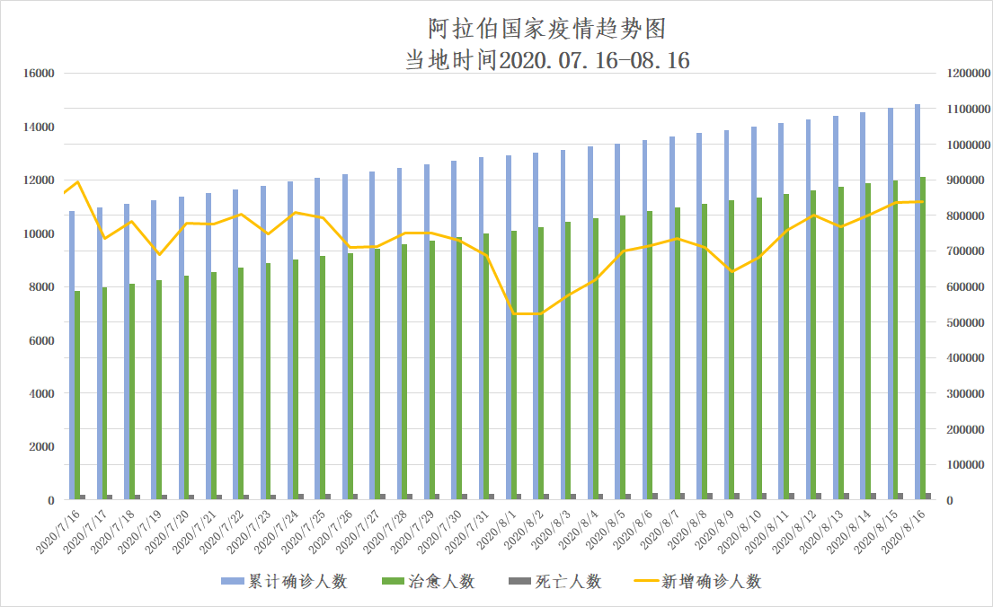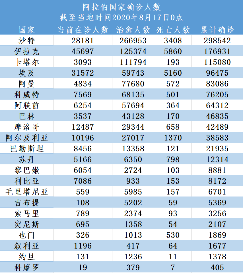 截至当地时间8月17日0点,阿拉伯国家累计确诊1112602例,死亡20406例,治愈908191例,较一周前新增确诊共计73123例。