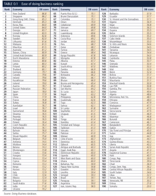 《2020年营商环境报告》中关于营商环境全球排名的报表