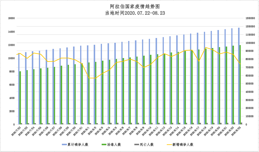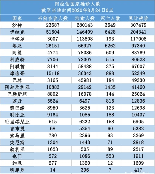 截至当地时间8月24日0点,阿拉伯国家累计确诊1186134例,死亡21851例,治愈972851例,较一周前(8月17日0点)新增73532例。