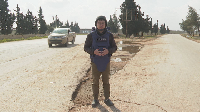 △今年二月,总台记者朱雪松在伊德利卜省M4与M5公路交汇处采访报道