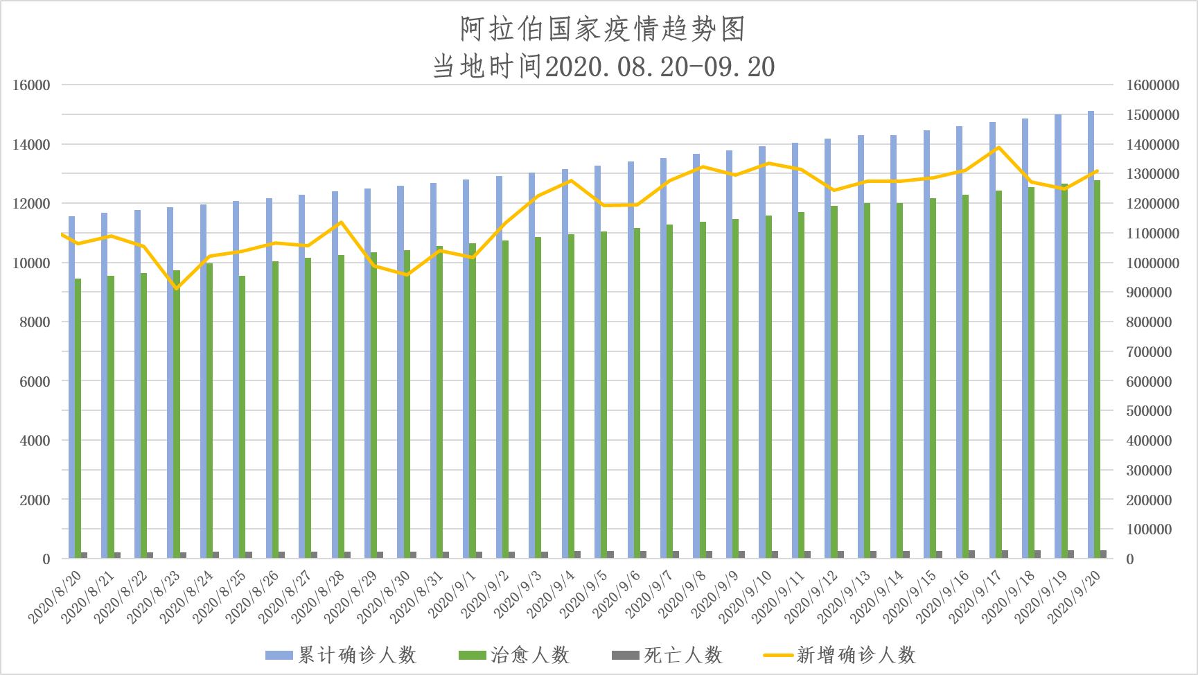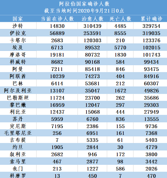 截至当地时间9月21日0点,阿拉伯国家累计确诊1499675例,死亡27453例,治愈1265649例,较一周前(9月14日0点)新增12491例。过去一周内,面对由于复工复产、学校开学、人员聚集、民众防控意识松懈而引起的第二波疫情,部分疫情反弹严重的阿拉伯国家继续收紧防疫措施。