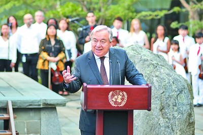 2019年9月20日,联合国秘书长古特雷斯在纽约联合国总部为纪念国际和平日而举行的和平钟敲钟仪式上表示,气候变化对世界和平构成威胁,国际社会需要采取紧急行动。新华社记者 李木子摄