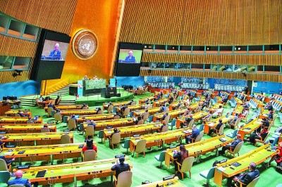 9月21日,在位于纽约的联合国总部举行的联合国成立75周年纪念峰会上,第75届联合国大会主席博兹克尔致辞。新华社发