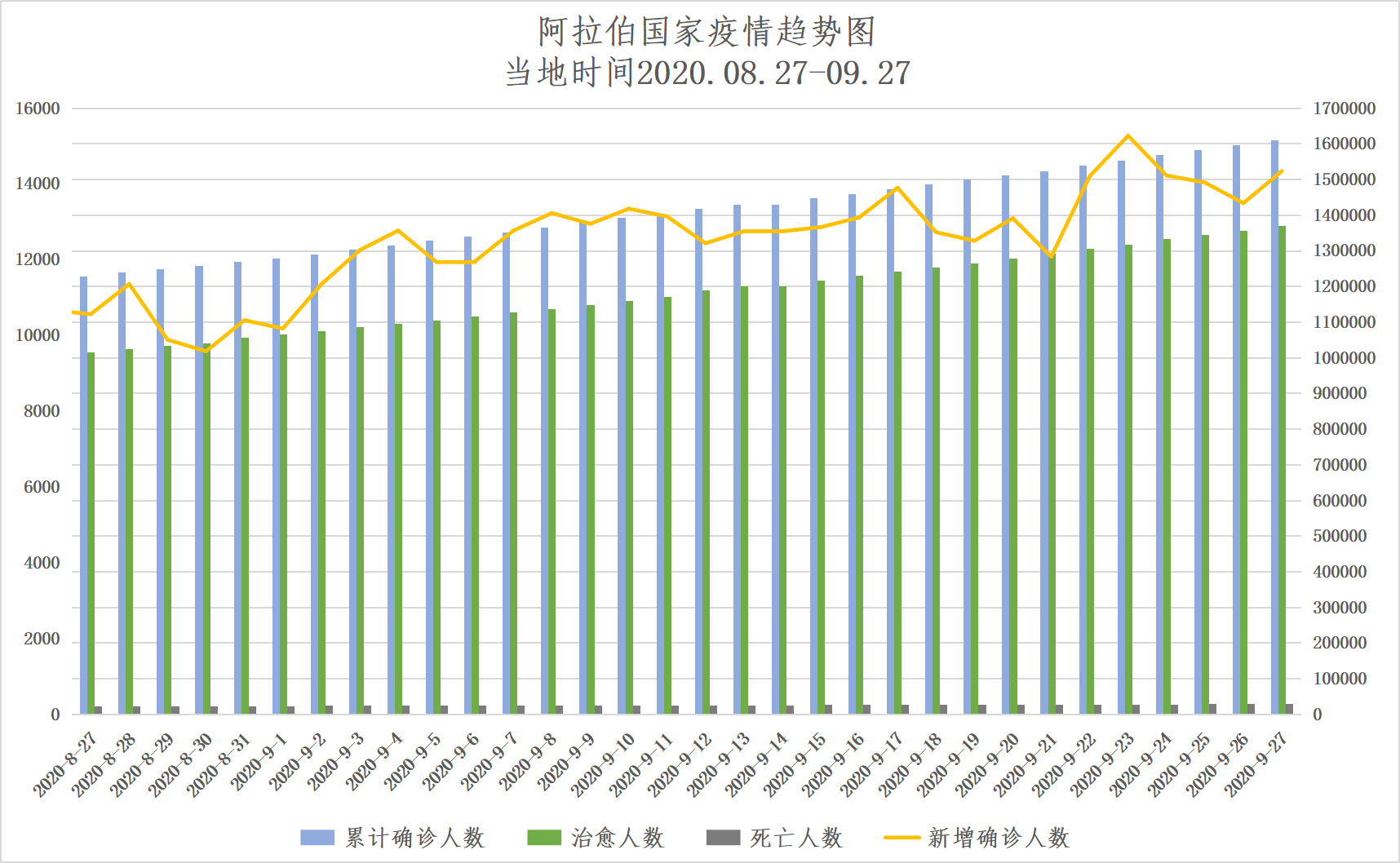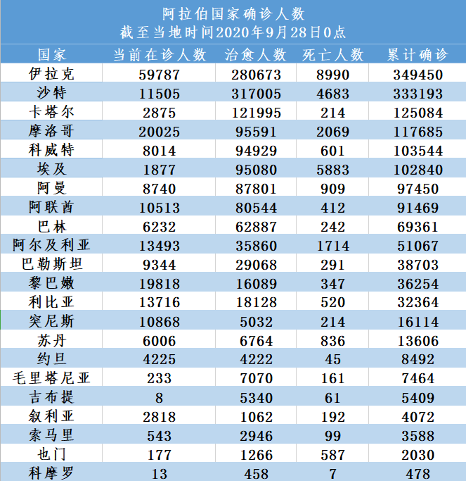 截至当地时间9月28日0点,阿拉伯国家累计确诊1609717例,死亡29077例,治愈1369810例,较一周前(9月21日0点)新增110042例。新冠疫情仍在阿拉伯国家蔓延,部分国家出现持续反弹之势。本周,科威特累计确诊病例已超10万例。