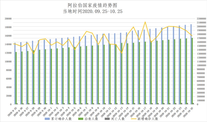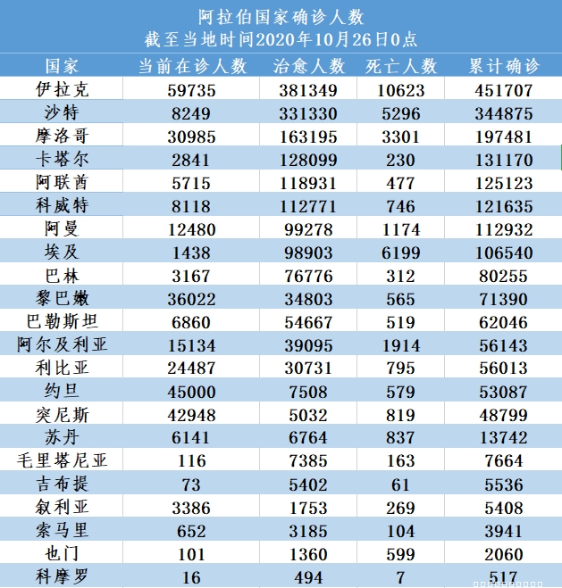 截至当地时间10月26日0点,阿拉伯国家累计确诊2058064例,死亡35589例,治愈1708811例,较一周前(10月19日0点)新增120743例。随着气温转低,一些国家呼吁民众警惕第二波疫情到来,开始采取更严格的防控措施,并加强对民众的防疫劝导。