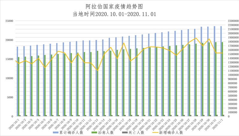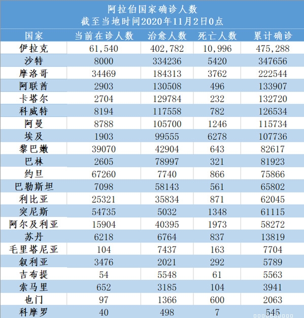 截至当地时间11月2日0点,阿拉伯国家累计确诊2189183例,死亡37859例,治愈1800300例,较一周前(10月26日0点)新增131119例。中东新冠疫情持续蔓延,多国继续严格防控。