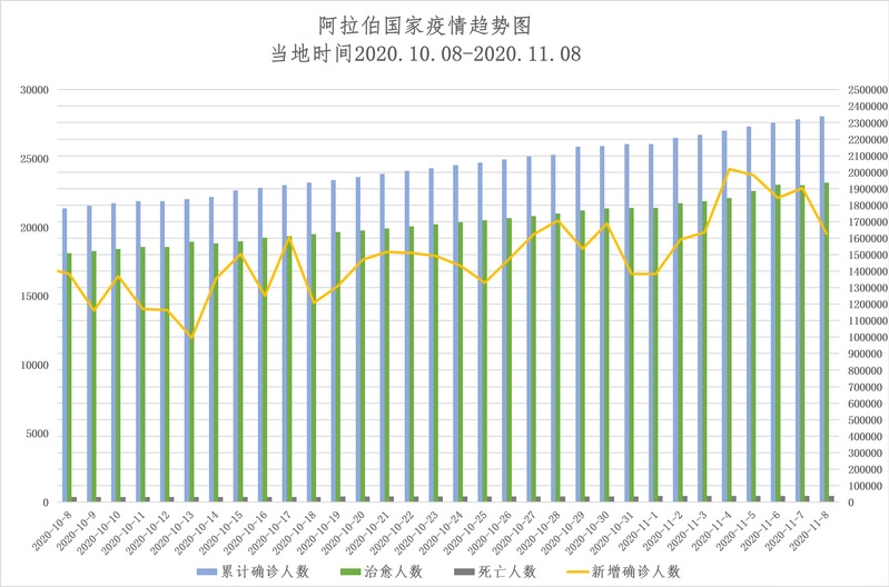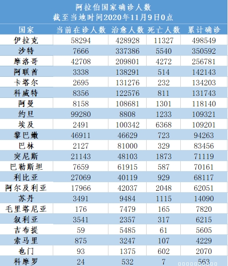 截至当地时间11月9日0点,阿拉伯国家累计确诊2340432例,死亡40461例,治愈1935851例,较一周前(11月2日0点)新增151249例,疫情出现较大幅度反弹。