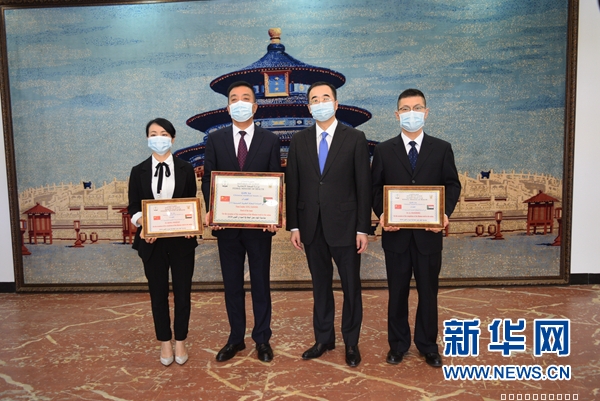 中国驻苏丹大使马新民(中)向出席会议的中国第35批援苏医疗队队长郭亚东及队员颁发苏丹联邦卫生部制作的荣誉证书。(马意翀 摄)