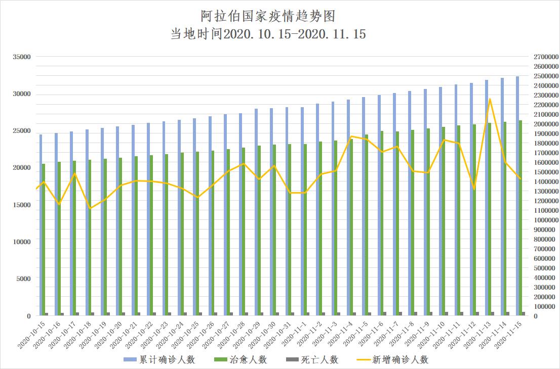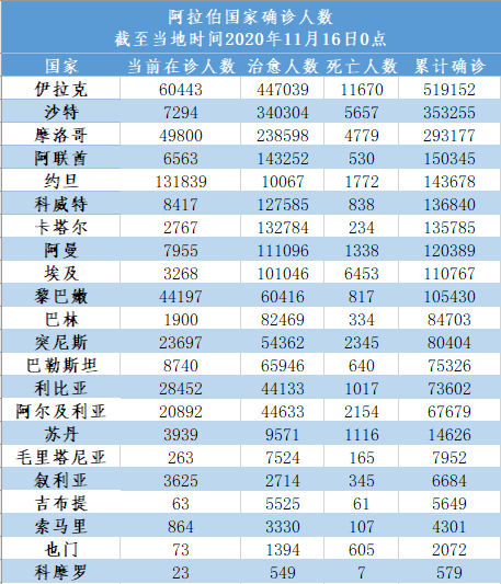 截至当地时间11月16日0点,阿拉伯国家累计确诊2492395例,死亡42984例,治愈2034337例,较一周前(11月9日0点)新增确诊151963例。部分阿拉伯国家疫情形势依然严峻。